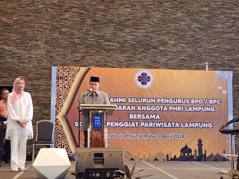 Hal tersebut disampaikan saat kegiatan silahturahmi seluruh pengurus BPD/BPC anggota PHRI Lampung bersama seluruh penggiat pariwisata Lampung di Hotel Novotel, Rabu (3/4/2024).